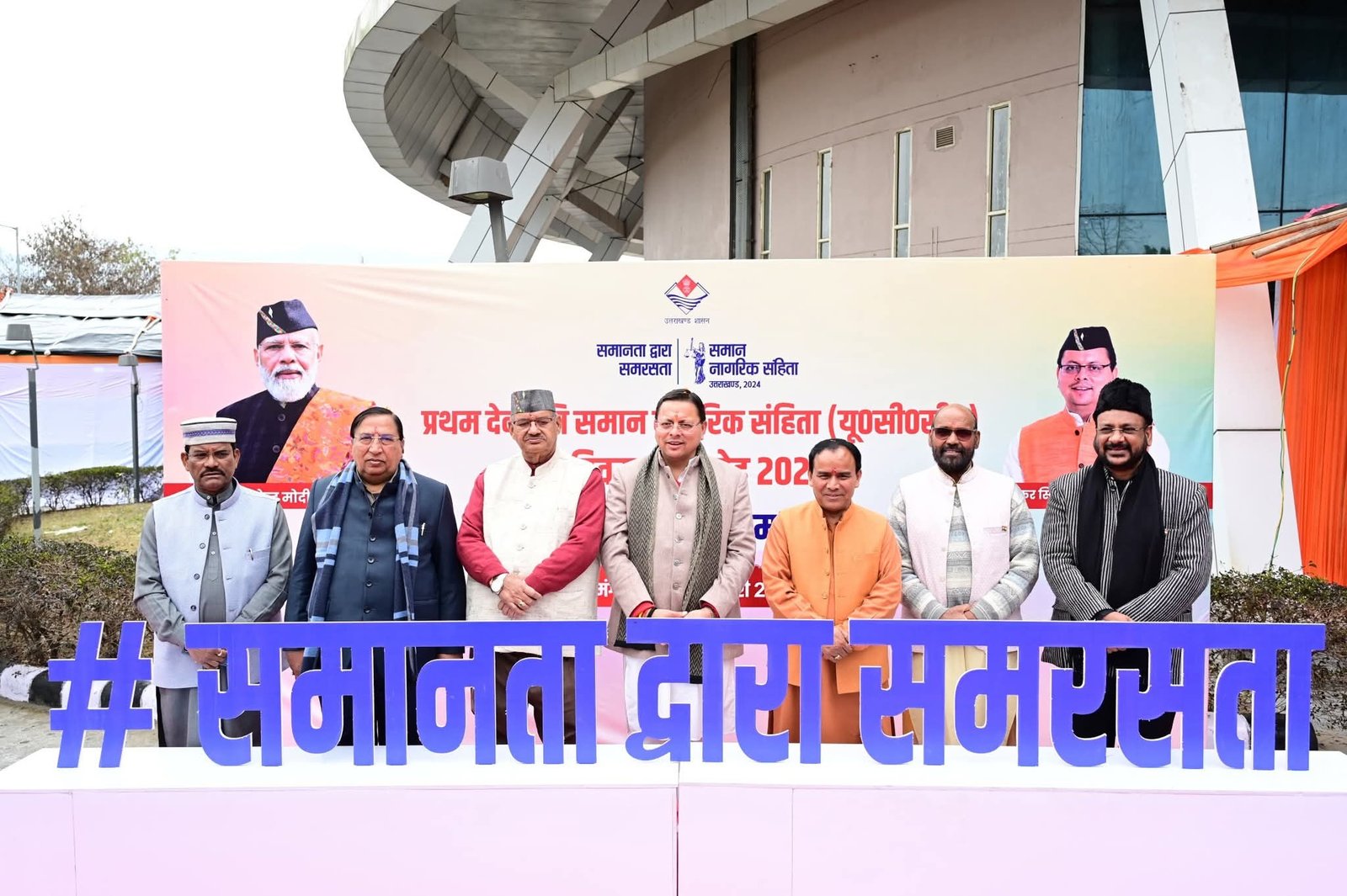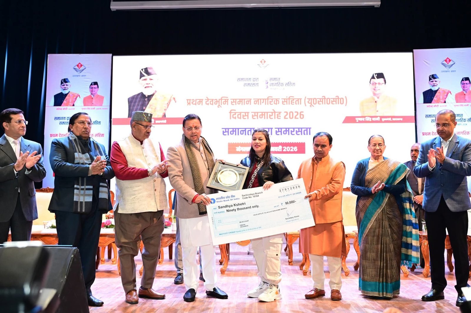 देहरादून में आयोजित प्रथम देवभूमि समान नागरिक संहिता (UCC) दिवस समारोह 2026 में सम्मिलित होकर देवतुल्य जनता को संबोधित करने के साथ ही समान नागरिक संहिता को तैयार करने वाले कमेटी के सदस्यों, प्रशासनिक अधिकारियों और पंजीकरण में योगदान देने वाले वीएलसी को सम्मानित किया। इस अवसर पर यूसीसी आधारित फोटो प्रदर्शनी का भी शुभारंभ किया।