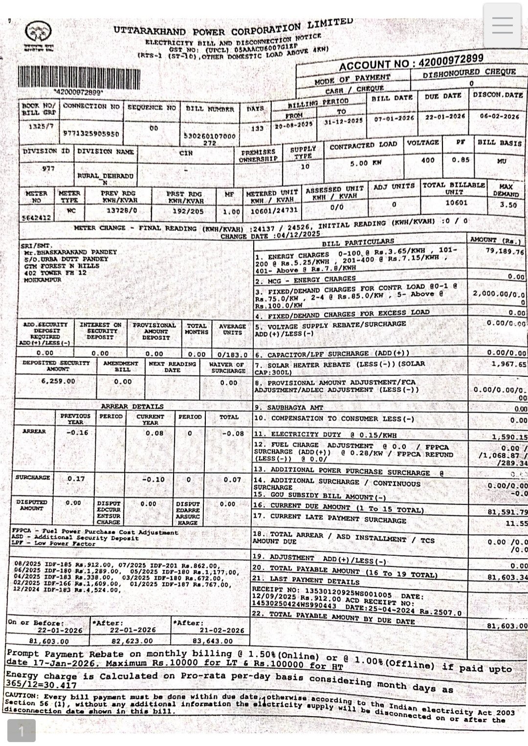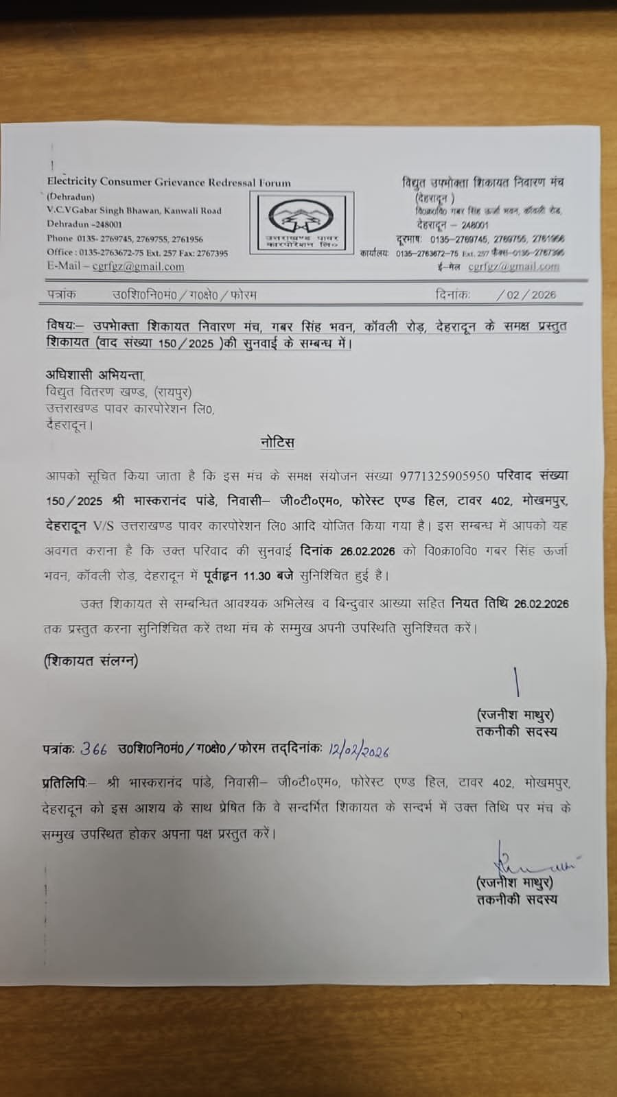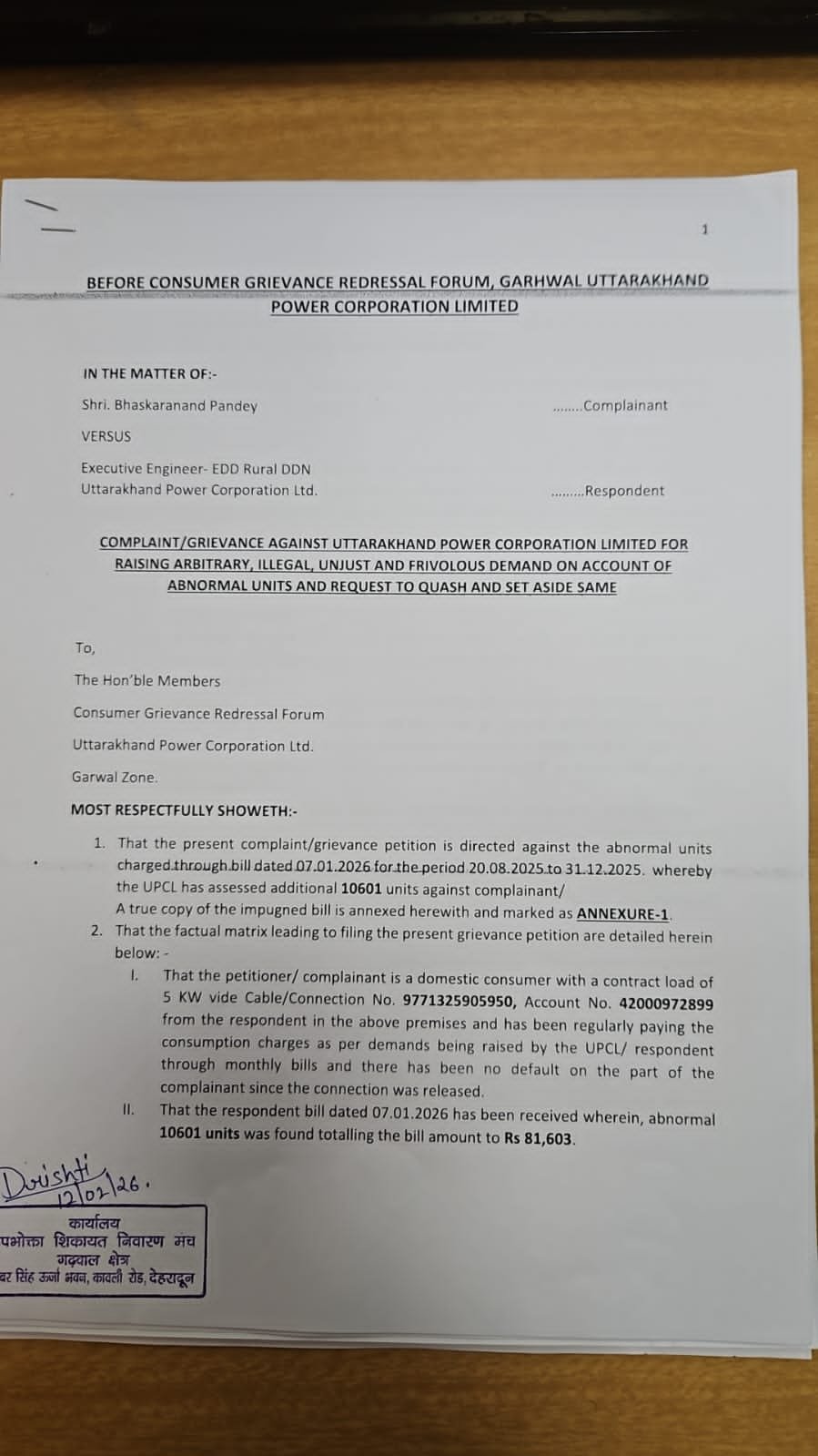 इस संबंध में उपभोक्ता ने Uttarakhand Power Corporation Limited (यूपीसीएल) के खिलाफ औपचारिक शिकायत दर्ज कराई है, जो अब Electricity Consumer Grievance Redressal Forum, गबर सिंह भवन, कांवली रोड, देहरादून में विचाराधीन है। परिवाद संख्या 150/2025 के तहत मामले की सुनवाई 26 फरवरी 2026 को पूर्वाह्न 11:30 बजे निर्धारित की गई है।