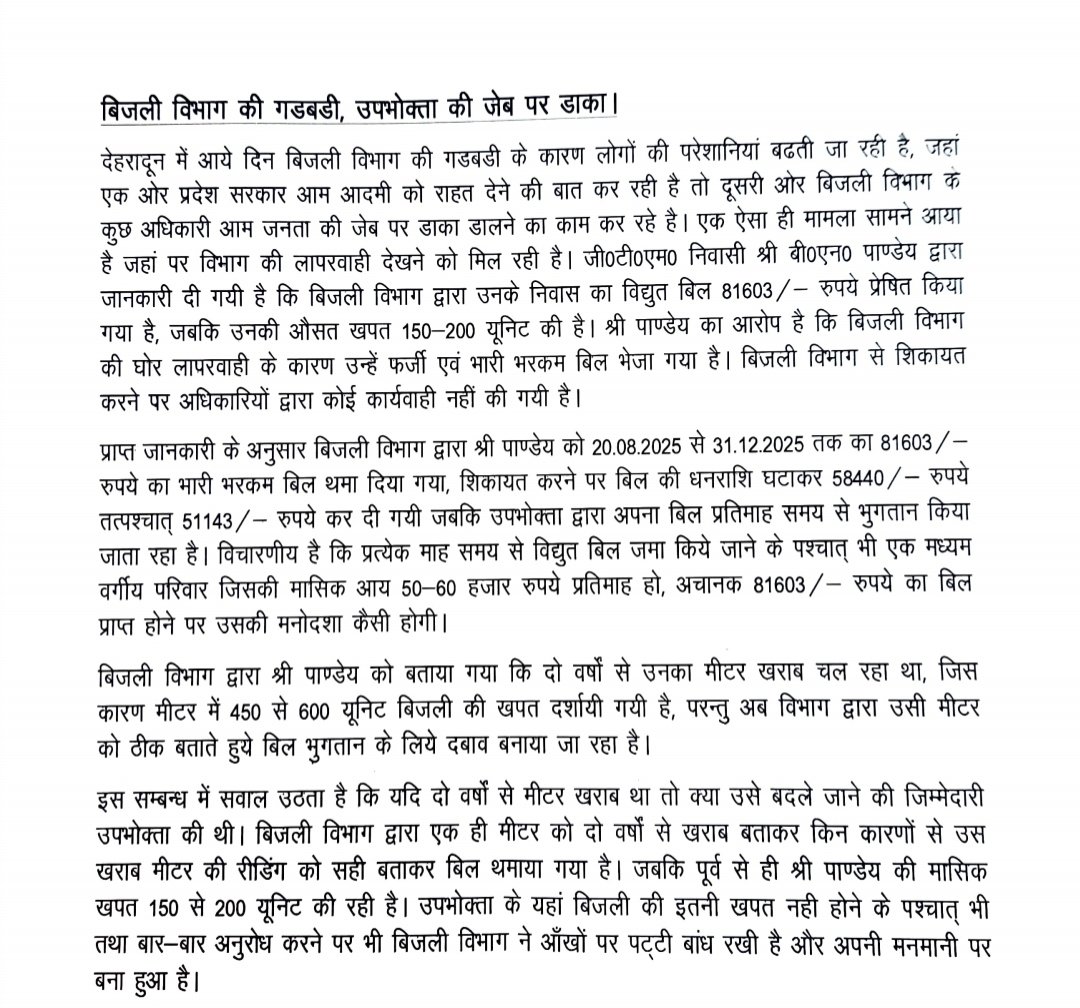 देहरादून। स्मार्ट मीटर व्यवस्था को पारदर्शी और सटीक बिलिंग प्रणाली के रूप में लागू किया गया था, लेकिन अब इसी व्यवस्था पर सवाल खड़े हो रहे हैं। मोखमपुर क्षेत्र के एक उपभोक्ता के यहां स्मार्ट मीटर में मात्र 193 यूनिट की खपत दर्ज होने के बावजूद करीब 81,000 रुपये का बिजली बिल जारी होने का मामला सामने आया है।