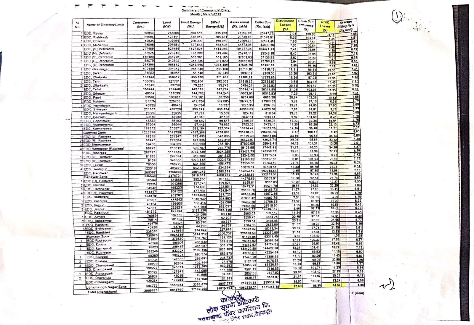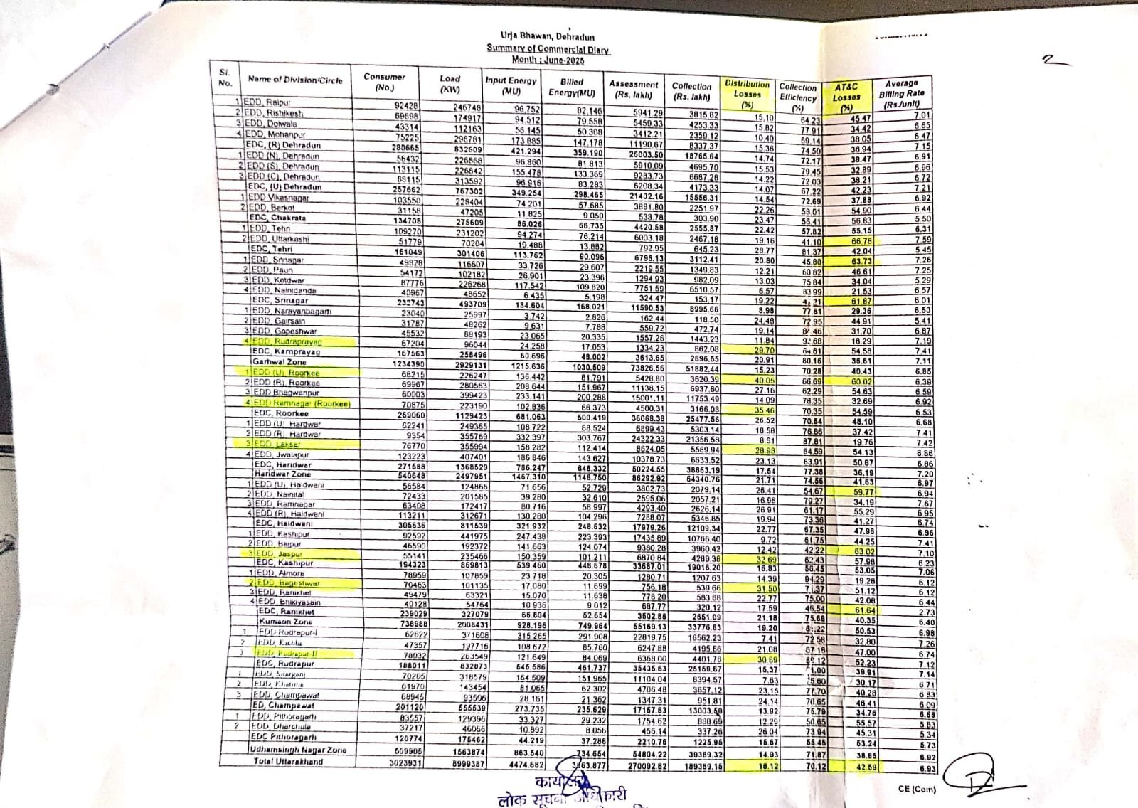 अगर आंकड़ों की बात करें तो जून 2025 के अंत में रुड़की शहरी क्षेत्र में 40.05 फ़ीसदी, रामनगर (रुड़की) 35.46, जसपुर 32.69,बागेश्वर 31.50, रुद्रपुर द्वितीय 30.89,लक्सर 28.98,रुद्रप्रयाग 29.70, हल्द्वानी (शहरी) 26.41, रामनगर 26.91 फ़ीसदी तथा इसी प्रकार लगभग 15 वितरण खंडों में 20 से 25 फ़ीसदी लाइन लॉस था | अगर ए टी & सी लॉसेस की बात करें तो टिहरी 66. 78 फ़ीसदी, नैनी डांडा 61.87,बाजपुर 63.2 तथा भिकिया सेंण 61.64 फ़ीसदी है | कुल मिलाकर जून 2025 के अंत में प्रदेश भर का लाइन लॉस 18.12 फ़ीसदी था |