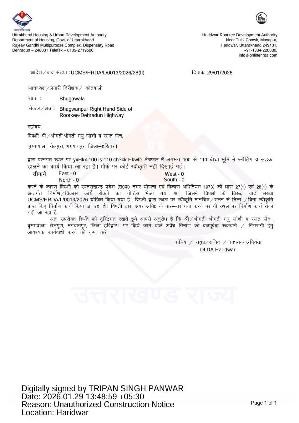 सचिव आवास डॉ. आर. राजेश कुमार के स्पष्ट विज़न और कड़े प्रशासनिक निर्देशों के तहत तथा हरिद्वार–रुड़की विकास प्राधिकरण की उपाध्यक्ष श्रीमती सोनिका की भ्रष्टाचार के विरुद्ध ज़ीरो टॉलरेंस मुहिम के चलते इस पूरे प्रकरण का तत्काल संज्ञान लिया गया।